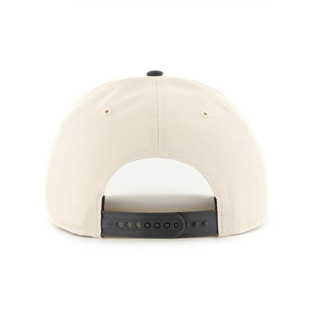 This hat features the ’47 HITCH style — a structured and curved adjustable with flat embroidery on the front and a plastic snapback closure.